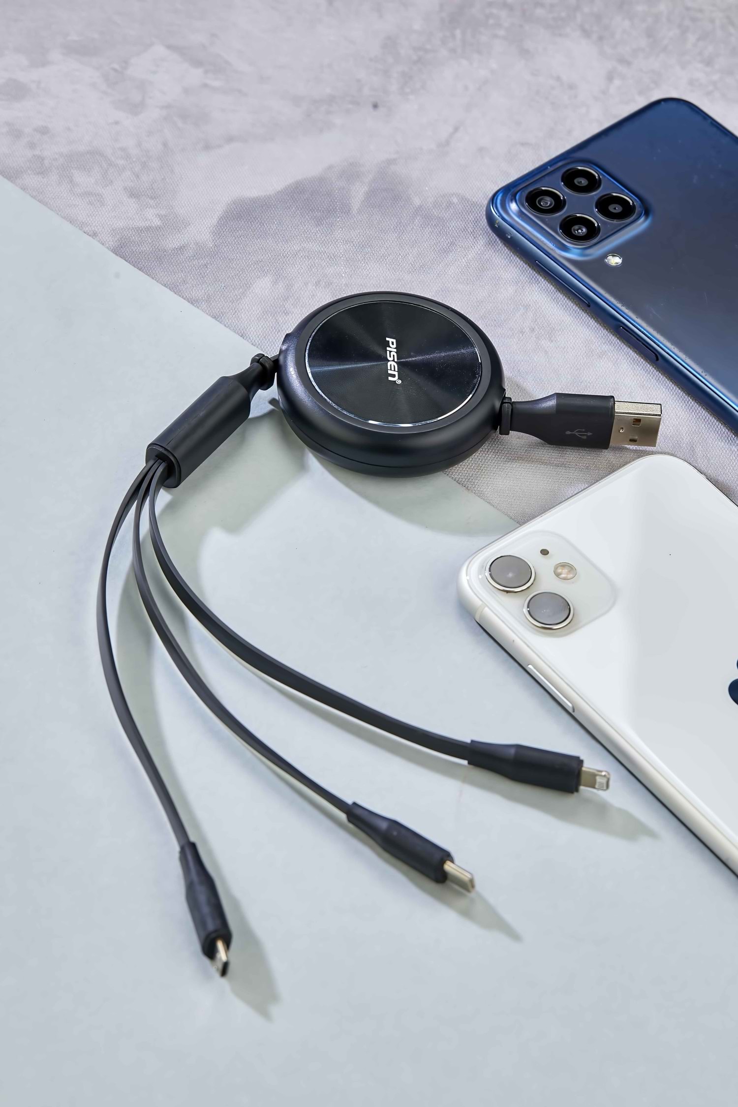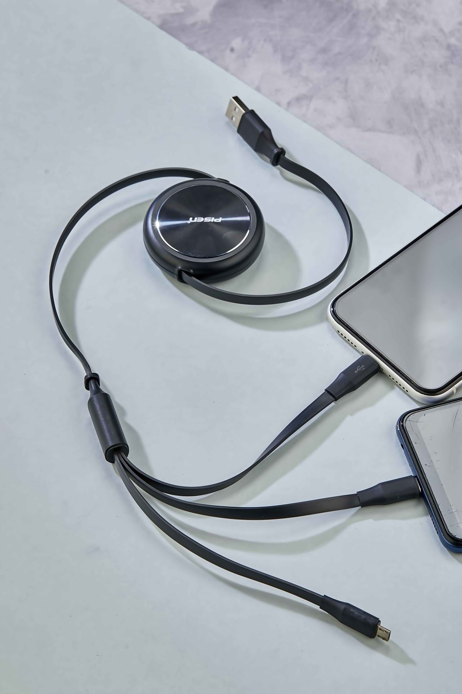 Ürün Ebadı : 29 x 5,5 x 1,8 cm Açık Ölçü : 120 cm Alüminyum Kasa Type C + Micro Usb + Lightning 3 Lü Şarj Olanağı Makaralı sargı