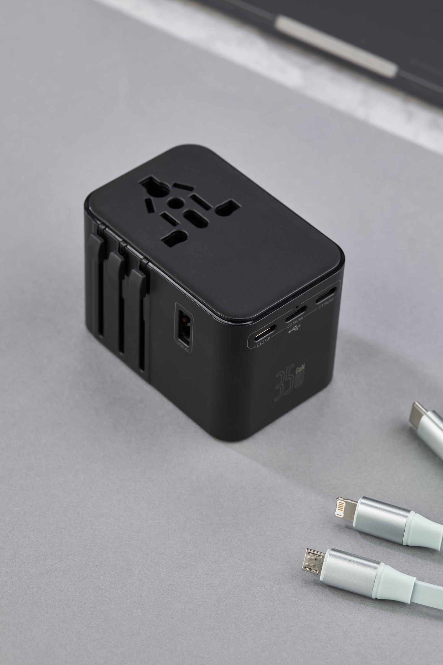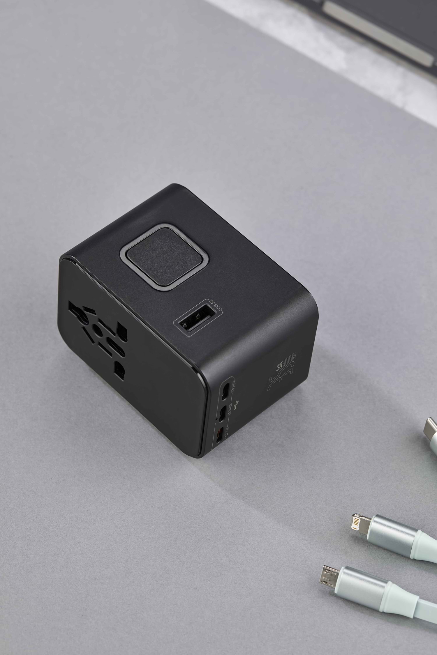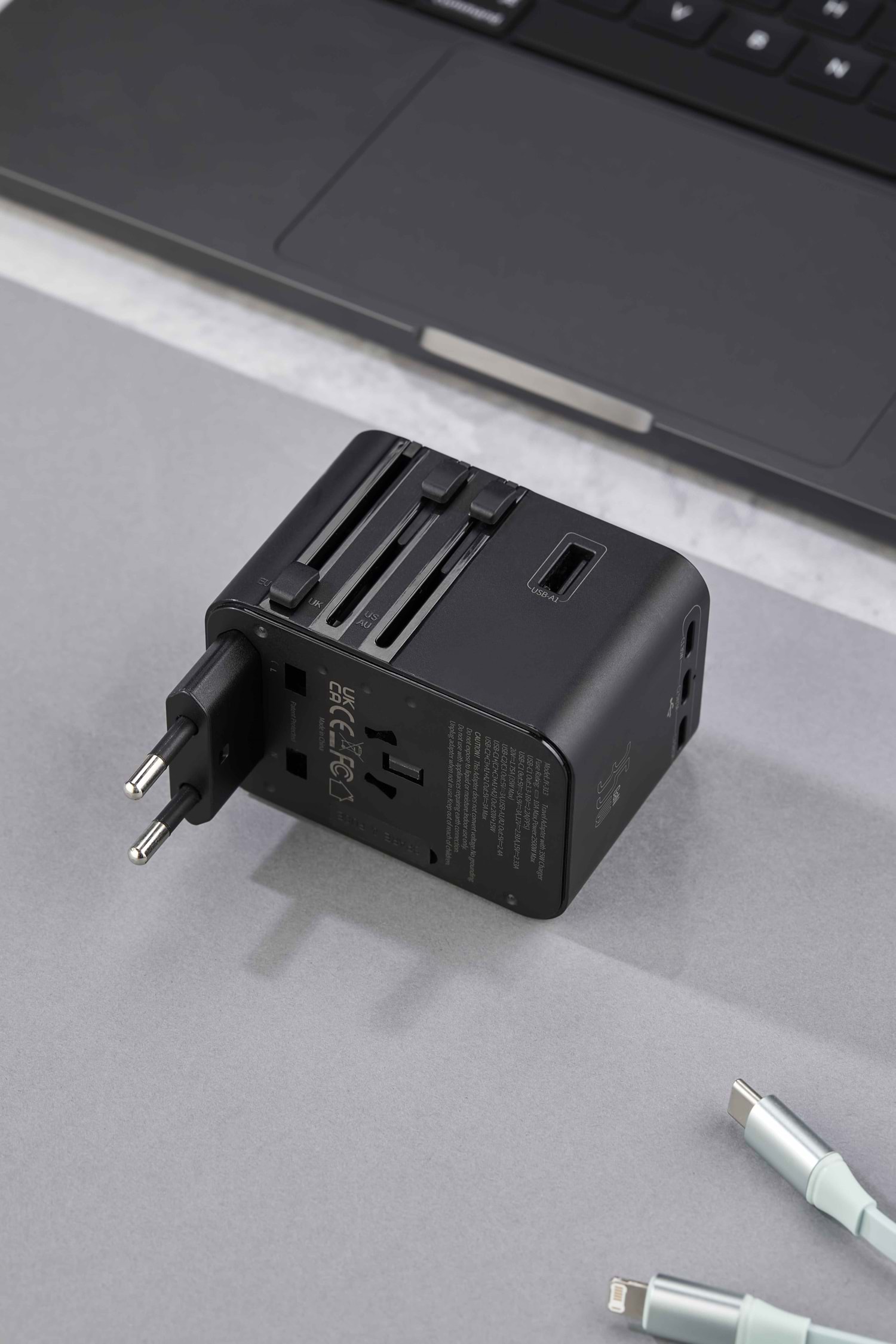 Ürün Ebadı : 5,5 x 7,6 x 5,3 cm Yüksek Performanslı Seyahat Adaptörü USB + Type-C + PD Çıkış Dahili Global Priz Başlık ve Yuvaları 45W Yüksek Performans 3 Adet USB C + 2 Adet USB A